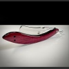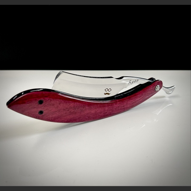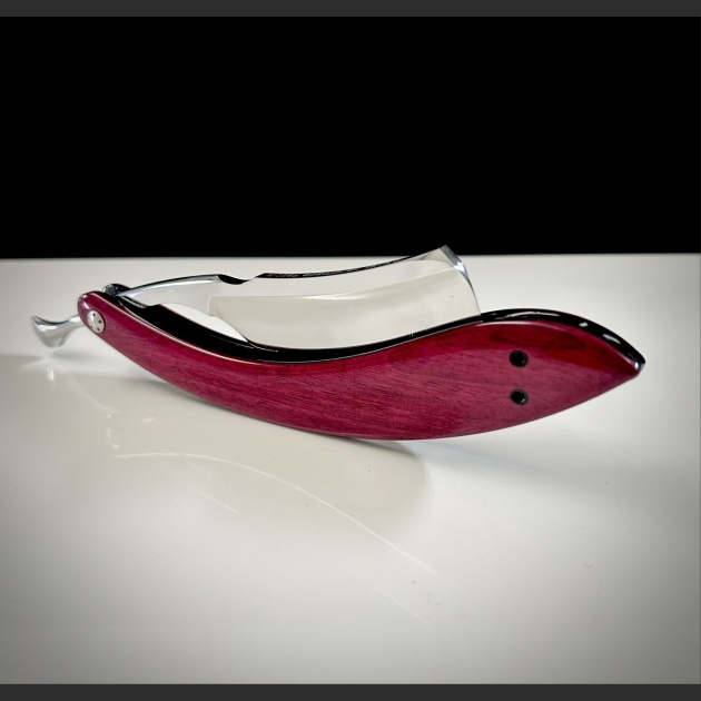 This new is made form a RWL 34 Damasteel and is a 7/8 full hollow grind smiley edge, finished in a mirror chrome polish , the scales are made from a Beautiful Purple Heart solid wood and carbon fiber inlays