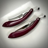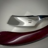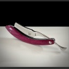 This new is made form a RWL 34 Damasteel and is a 7/8 Quarter hollow grind smiley edge, finished in a mirror chrome polish , the scales are made from Purple Heart wood with Silver carbon fiber inlays.