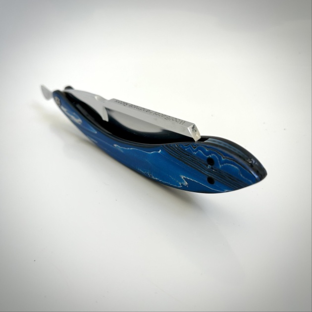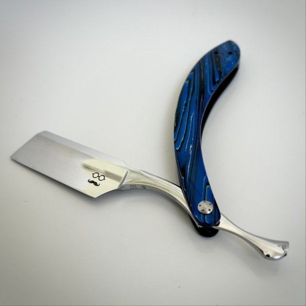 This new is made form a RWL 34 Damasteel and is a 7/8 Quarter hollow grind straight edge, finished in a mirror chrome polish , the scales are made from a a Blue and silver carbon fibre with carbon fibre inlays.